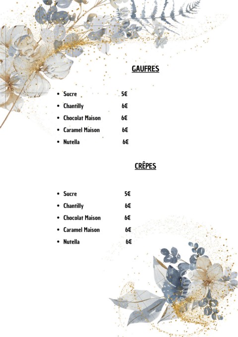 GAUFRES Sucre 5€ Chantilly 6€ Chocolat Maison 6€ Caramel Maison 6€ Nutella 6€ CRÊPES Sucre 5€ Chantilly 6€ Chocolat Maison 6€ Caramel Maison 6€ Nutella 6€